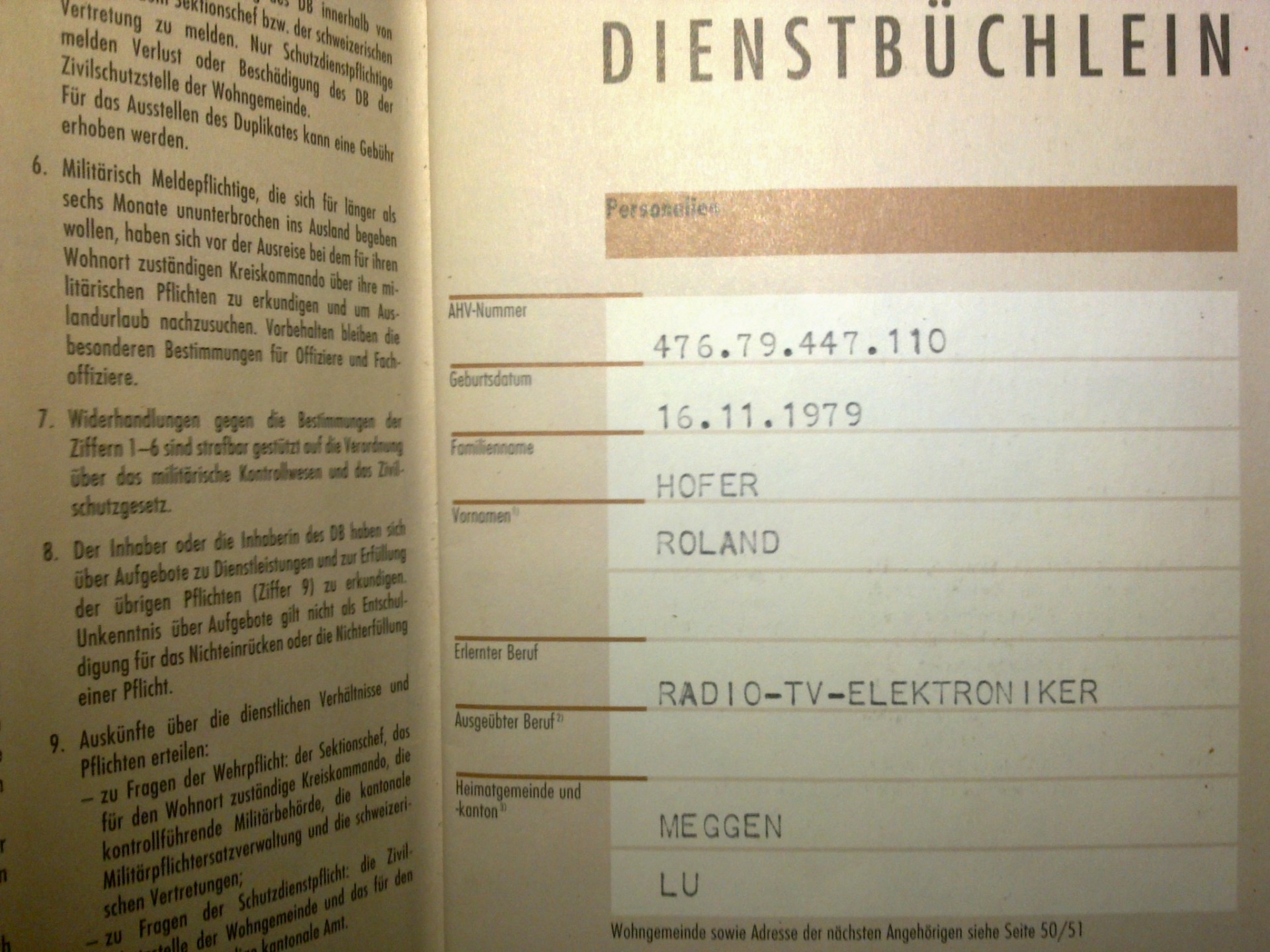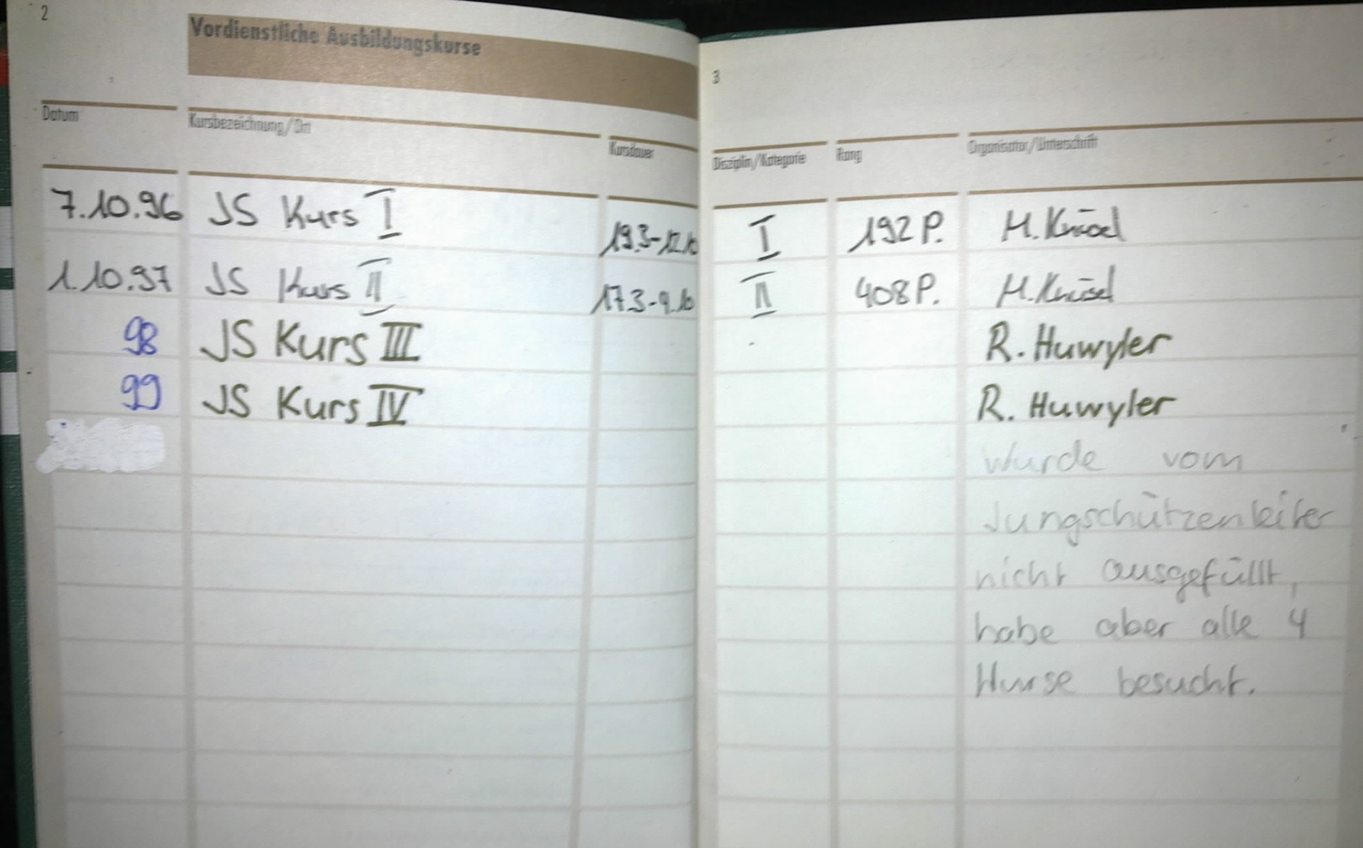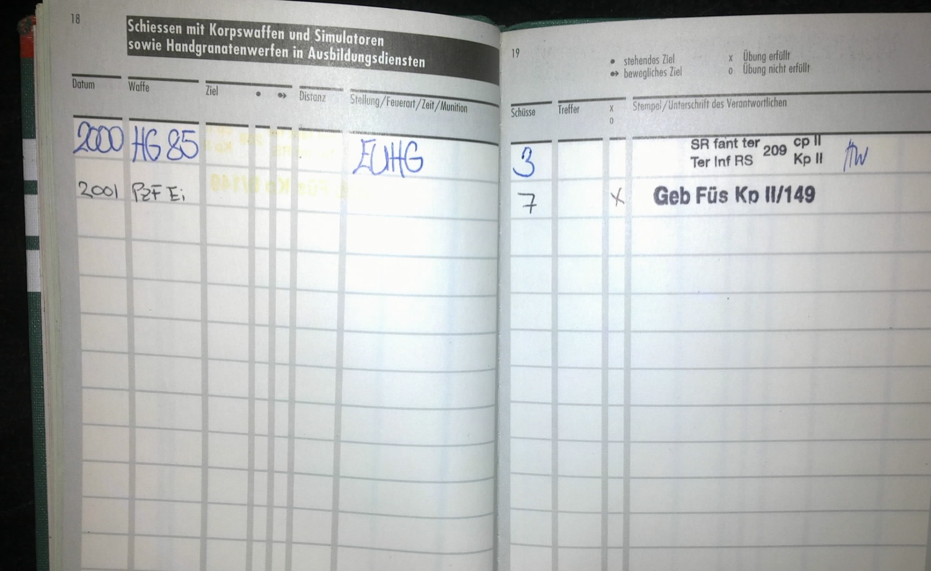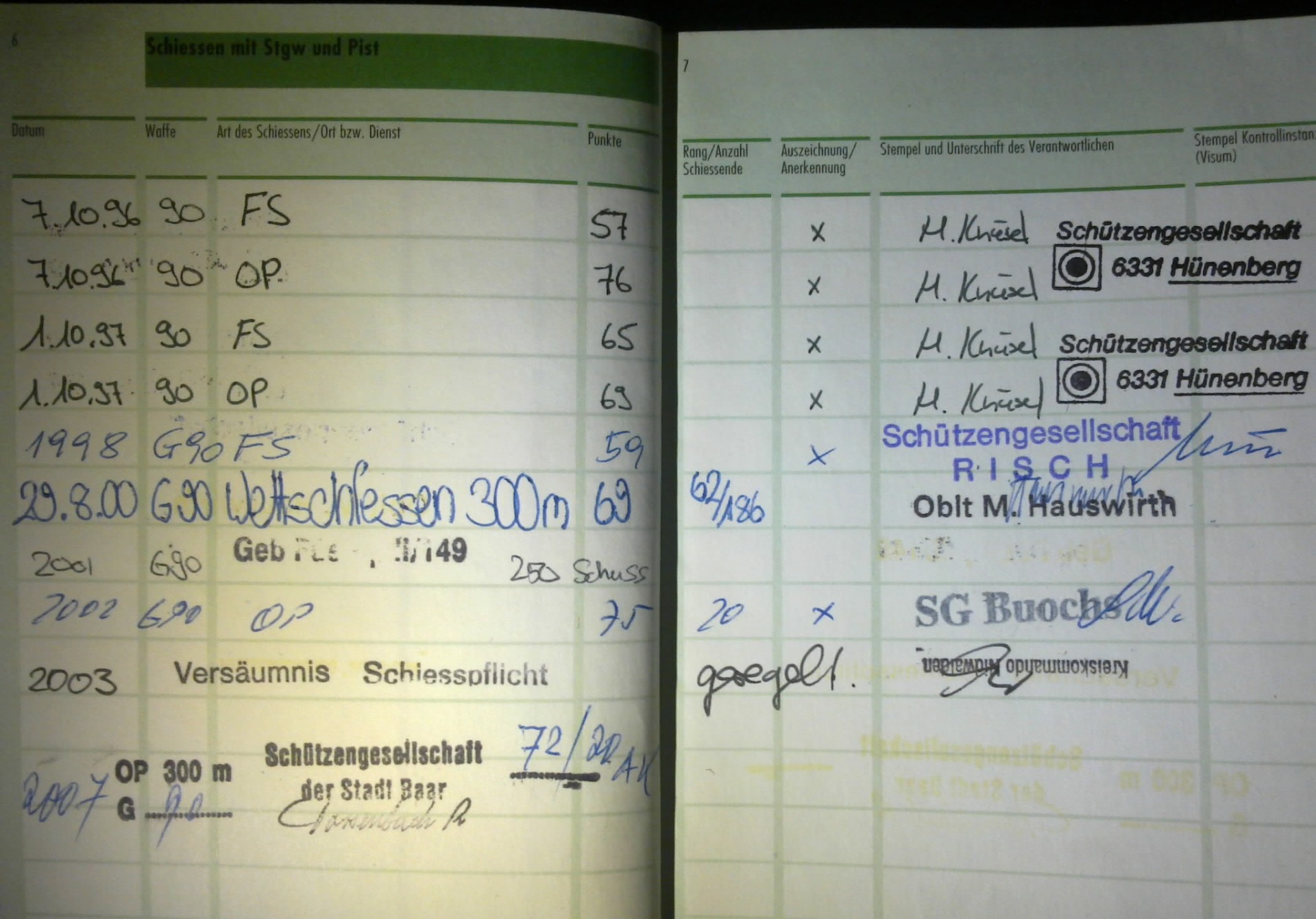 Vom Jahr 1996 bis 2000 absolvierte ich den militärischen Jungschützenkurs mit dem Sturmgewehr 90 (SIG550) der Schweizer Armee. Ich hatte den Traum ein Panzergrenadier zu werden. Der Offizier der die Aushebung machte sagte mir er könne mich schon zu den Panzergrenadieren einteilen aber ich sei vermutlich nur dass Schlusslicht. Ich wurde am 22. Oktober 1998 mit einer Sporttestpunkteanzahl von 302 (Mindestpunkteanzahl für Grenadiere 320) als Territorial Füsilier eingeteilt. Ich bekomme wegen meines linken schrägen Nasenflügels nur etwa 60 % Luft durch das linke Nasenloch und kam im Rennen nicht so weit. Aber bei den anderen Disziplinen war ich zum Teil besser als der Durchschnitt. Die Aushebung war in Emmenbrücke in Luzern. Zwischen der Aushebung und der Rekrutenschule hatte ich leider zuviel Weider Mega Mass 2000 gegessen und deshalb war ich in der Rekrutenschule leicht zu fett. Weider Mega Mass 2000 ist ideal wenn man Muskelmasse während des Bodybuilding Trainings, aufbauen möchte. Aber wenn man zuviel davon nimmt wird man fett. Ich hatte im Jahr 2000 in Airolo im Kanton Tessin in der Schweiz eine 15 Wochen Rekrutenschule als Territorial Füsilier geleistet. Danach leistete ich Wiederholungskurse in Andermatt, Göschenen, Walenstadt, Dallenwil und Genf. Neben der Ausbildung am Sturmgewehr 90 wurde ich auch an der Handgranate 85 und an der Panzerfaust ausgebildet. Diensttage 200. Ich schiesse gerne und hatte schon als Teenager selber Waffen gekauft. Ich hatte eine Daisy 880 4,5 mm (Weihnachtsgeschenk 1995, mein Bruder Martin auch), Gamo PR15 (4,5 mm, Ferienjob), Crossman Colt Python (4,5 mm, 6 Zoll Lauf, Co2, Weihnachtsgeschenk), RWS Dynamite Nobel 225 (4,5 mm, Co2, mit Lehrlingslohn), markenlose Knicklaufluftpistole von Italien (gelbe Fingerhutgummizapfen 6 mm aber der Lauf war gezogen und 5,5 mm, mit Taschengeld), Heckler & Koch MP5 (vollautomatische elektro Softair 6 mm, mit Lehrlingslohn), Beretta FS93 (vollautomatische Softair Greengas 6 mm mit klappbarem Griff am Abzugsbügel, mit Lehrlingslohn), Walther PPK (Schreckschuss, mit Taschengeld in Italien), Röhm RG3 (Schreckschuss 6 mm, Geschenk meines Vaters), Beretta FS92 (Schreckschuss 8 mm, mit Lehrlingslohn in San Marino Italien gekauft), M1 Garand (.30-06, mit Lehrlingslohn und Weihnachtsgeschenk Anteil meiner Eltern), M1 Carbine (.30 Carbine, mit Lehrlingslohn), Winchester 1300 Defender (12,7 mm, mit Lehrlingslohn), Surmgewehr 57 (7,61 mm Swiss Ordonance, Lohn), 1911 Schweizer Karabiner (7,61 mm, Geschenk meines Vaters), Chinesische Kopie der Sig Sauer P226 (9mm, Lohn, hatte ich nur etwa 1,5 Monate und tauschte sie zum Neupreis plus 699 Sfr gegen eine originale P226), originale Sig Sauer P226 (9mm, Lohn), von 1996 bis 2000 Sturmgewehr SIG550 (.223, Schweizer Armee Eigentum), von 2000 bis 2006 zweites Sturmgewehr SIG550 (.223, Schweizer Armee Eigentum). Alle diese Waffen habe ich heute nicht mehr. Damals in den 90er hatte ich etwa mit 16 Jahren etwa drei kleine Vögel mit dem Luftgewehr erschossen. Heute als Erwachsener tut mir das Leid. Ich bin grundsätzlich dagegen dass man Tiere zum Spass erschiesst. Nur wenn ein Mensch auch wirklich keine Möglichkeit hat Essen zu kaufen, darf ein Mensch jagen. Ich frage mich sehr warum es so viele Menschen auf der Welt gibt die aus Spass Eichhörnchen, Murmeltiere oder Hasen erschiessen wollen.